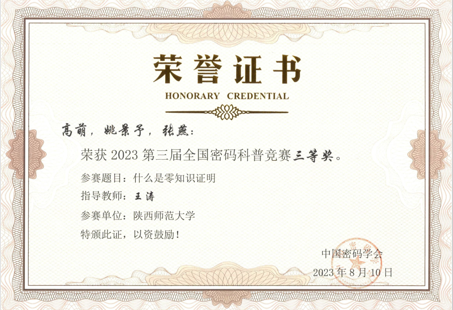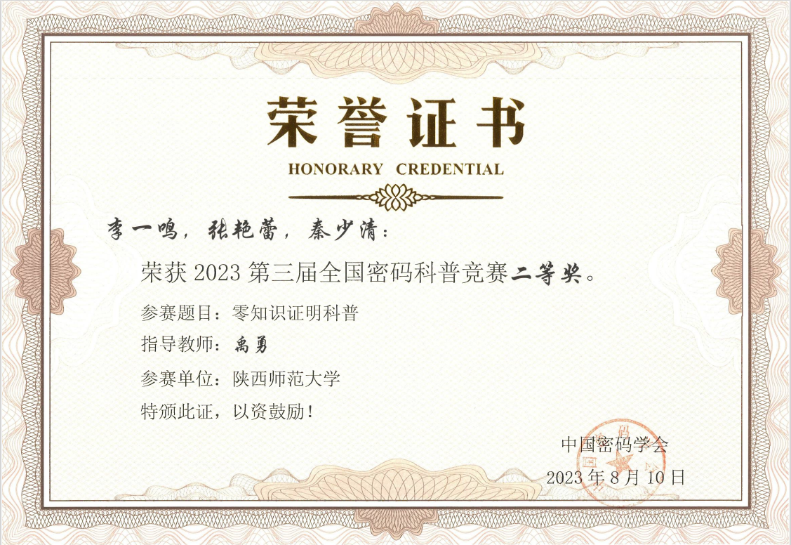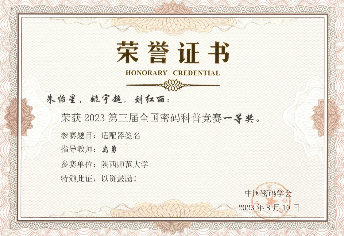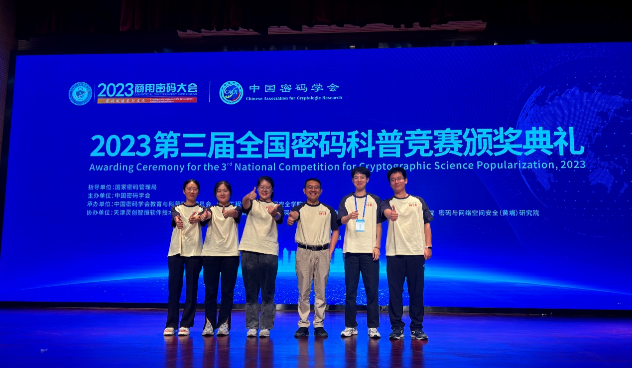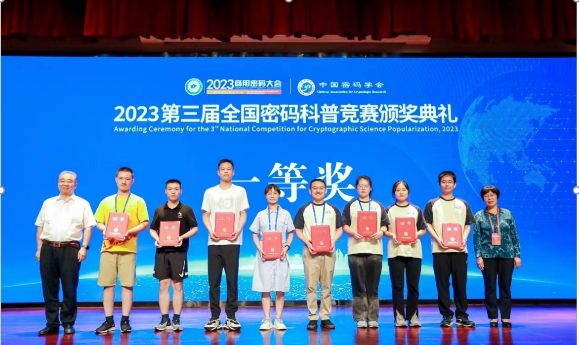 2023年8月9日至10日,由国家密码管理局指导、中国密码学会主办的第三届全国密码科普竞赛决赛及颁奖典礼在郑州“2023商用密码大会”期间隆重举行。必赢官网3支参赛队伍分别取得了一等奖、二等奖和三等奖的优异成绩,充分展现了必赢官网师生的创新精神和科研实力。