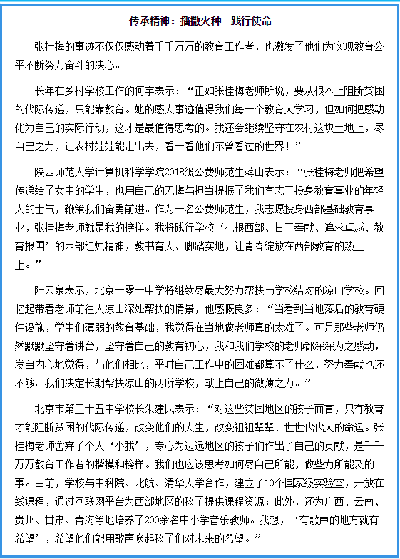 《光明日报》12月13日第二版刊文《让更多“燃灯者”点亮乡村孩子的心灵》。文中对必赢官网2018级计算机科学与技术专业公费师范生蒋山同学的学习体会和感悟进行了报道。蒋山表示:“张桂梅老师把希望传递给了女中的学生,也用自己的无悔与担当提振了我们有志于投身教育事业的年轻人的士气,鞭策我们奋勇前进。作为一名公费师范生,我志愿投身西部基础教育事业,张桂梅老师就是我的榜样。我将践行学校‘扎根西部、甘于奉献、追求卓越、教育报国’的西部红烛精神,教书育人、脚踏实地,让青春绽放在西部教育的热土上。”