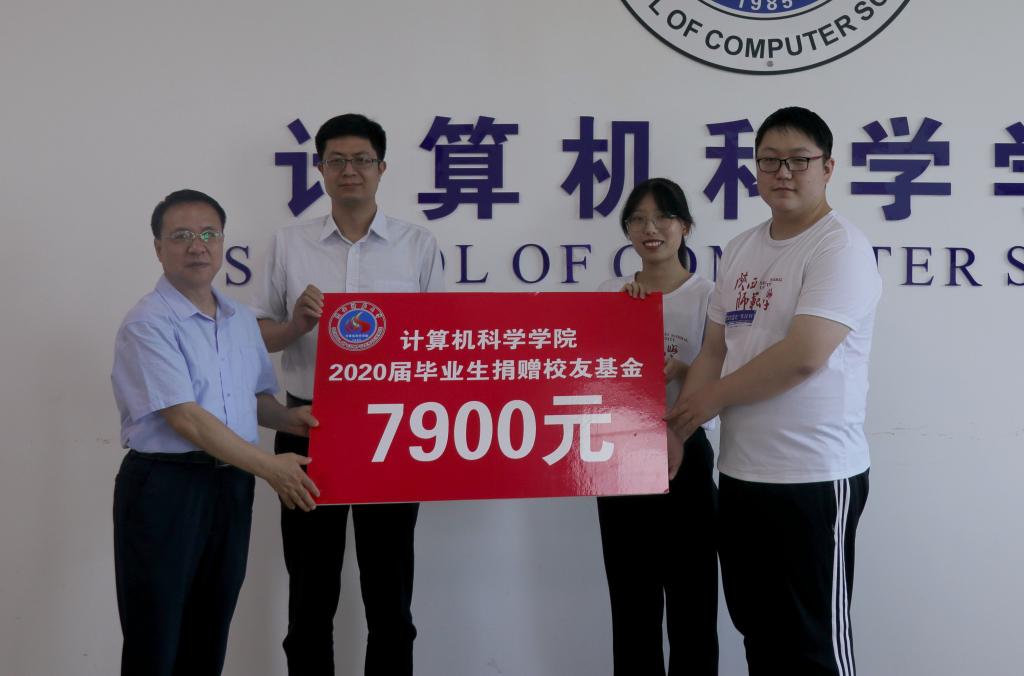 接下来学院和毕业生互赠礼物。王小明和马苗代表学院为毕业生代表赠送纪念品——定制纪念戒。纪念戒盒子上印着学院院徽和必赢优惠y272net字样,纪念戒指外侧镌刻学院名称及院训“正行·明理·通道”,内侧刻有毕业生姓名和学号,每枚戒指私人订制,独一无二,旨在希望2020届毕业生们不忘初心,将“师大计科人”的优良传统传承下去,载未来的道路上走的更稳、更远。随后,毕业生代表向学院校友交流基金捐赠校友基金7900元,这份心意承载着2020届毕业生对学院的感恩之情,愿学院年年桃李,岁岁芬芳。