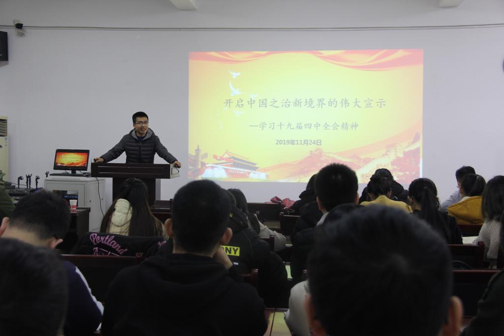 张璐老师以《开启中国之治新境界的伟大宣示》为题,从理论内涵、时代背景、文本分析和践行路径四个方面对党的十九届四中全会进行了详细全面的解读和分析。在报告的最后,张璐老师以“信仰制度、增强底气”八个字结束自己的讲座,并对在场同志提出了几点要求。一是作为党员,目前最应该做的就是积极参加党组织的活动,经常检视自己的问题与不足、开展批评和自我批评;二是不随便发表不当言论,对于学习生活中遇到的错误的行为和言论要及时制止,发挥好党员的先锋模范作用;三是同学们生逢其时,同时也是重任在肩,要认识到自己的渺小,也要认识到自己的崇高,要坚定“四个自信”,对我们国家的未来充满信心并为之而努力奋斗。