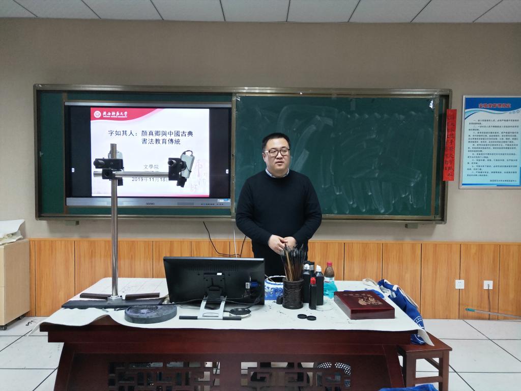 为提高学院公费师范生书写能力、传承中华优秀传统文化,必赢官网邀请我校文学院教师、砚友书画社指导老师杨国庆开展了“字如其人:颜真卿与中国古典书法教育传统”书法培训。学院部分公费师范生、第二期“翰墨书香”书法班50余名学子参加培训。本次培训由学院党委秘书、团委书记郭康凌主持。