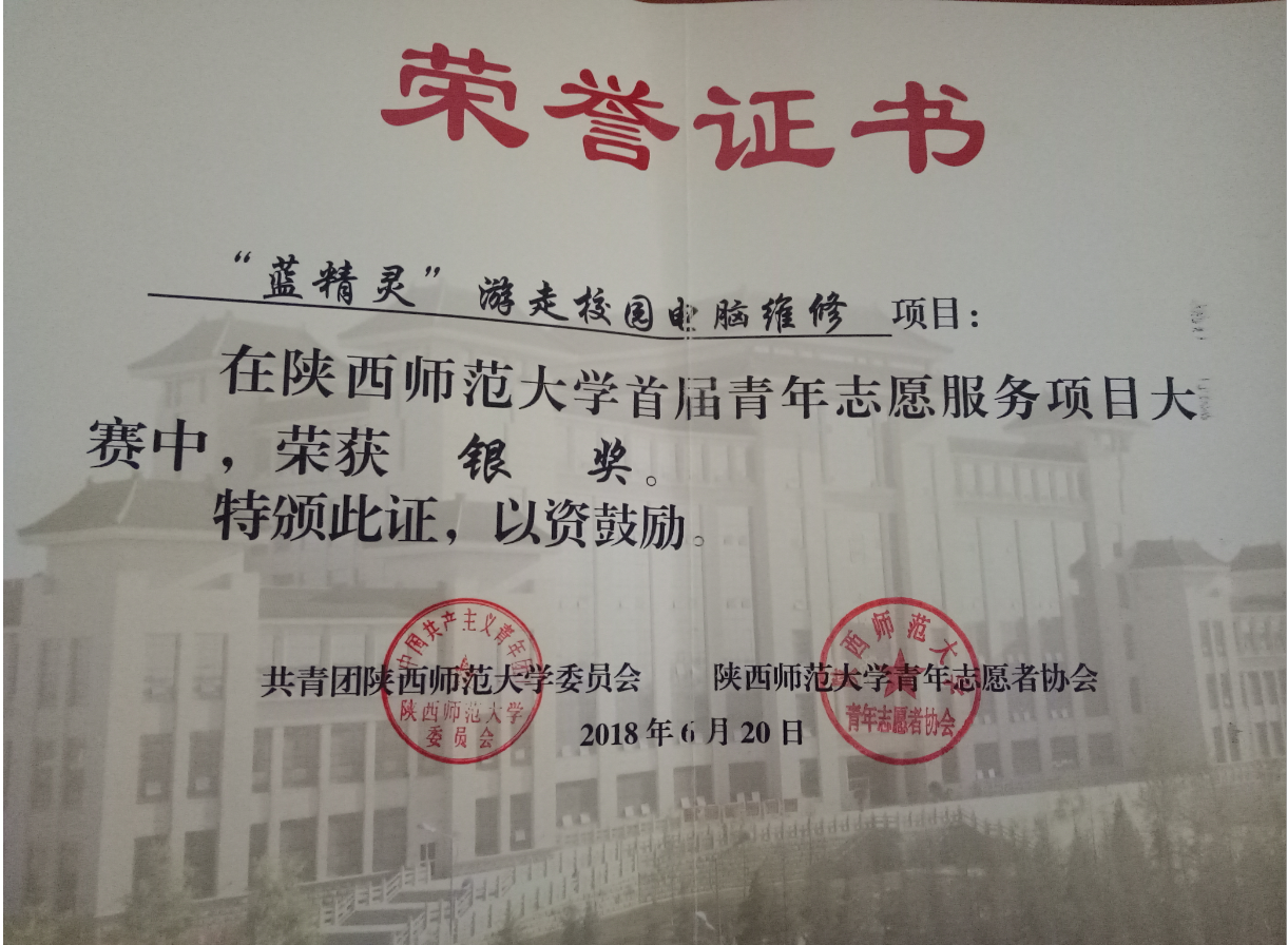 蓝精灵游走校园电脑维修项目:必赢优惠y272net首届青年志愿服务项目大赛银奖