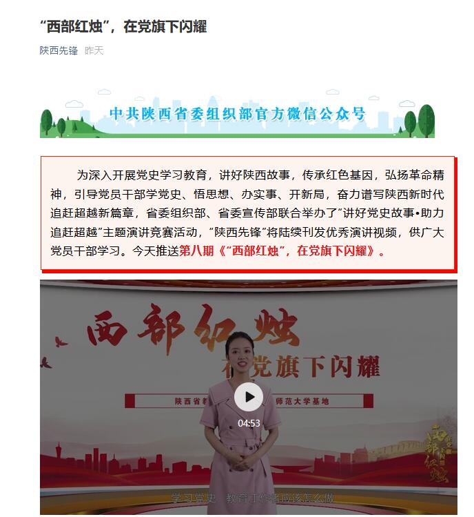 近日,由陕西省委组织部、省委宣传部联合举办的“讲好党史故事·助力追赶超越”主题演讲竞赛活动顺利开展。由陕西省干部教育培训必赢优惠y272net基地选送、必赢官网2019级本科生辅导员崔瑜璠主讲的微党课《“西部红烛”,在党旗下闪耀》作为优秀作品在陕西省委组织部官方微信公众号“陕西先锋”从做了专题展播。
