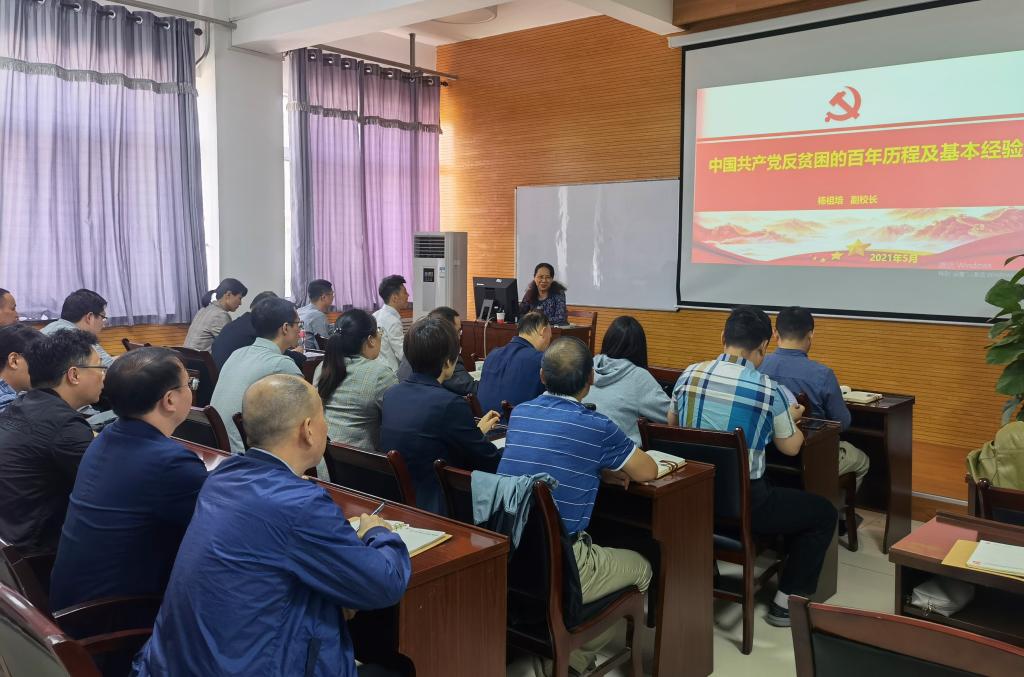 杨祖培以党成立以来的反贫困工作为主线,从反贫困的“百年历程”“伟大成就”“基本经验”三个方面讲述了党带领全国各族人民从聚焦土地斗争推动反贫困,到通过农村体制经济改革、政策扶持反贫困,再到决战脱贫攻坚确保全面建成小康社会的一路艰辛历程,用大量的数据、深刻的分析和生动的语言阐述了这场人类历史上规模最大、持续时间最长、惠及人口最多的减贫奇迹。杨祖培结合我校开展的脱贫帮扶工作实际谈到了高校在服务国家经济发展、推动反贫困工作进程中发挥的重要作用。她勉励学院师生要将个人成长与国家发展紧密结合,积极投身到社会主义现代化强国的建设中去。