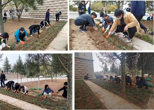 在后勤师傅的指导下,老师和同学们很快掌握了种草的过程和要求,迅速投入到种植作业中。挥锄挖土、种草培土,同志们分工合作、配合默契,认真细致地种好每一颗小草,做到了劲往一处使,汗往一处流,用心诠释着对大自然生命的关爱,整个活动现场热火朝天。大家沐浴在春光里,边劳动边交流,呼吸着花草的清香,体会着劳动的快乐,以实际行动践行绿色发展理念。不知不觉一个多小时过去了,看着一排排亲手栽种的小草随风起舞,焕发出勃勃生机,成就感在每个人心中油然而生。