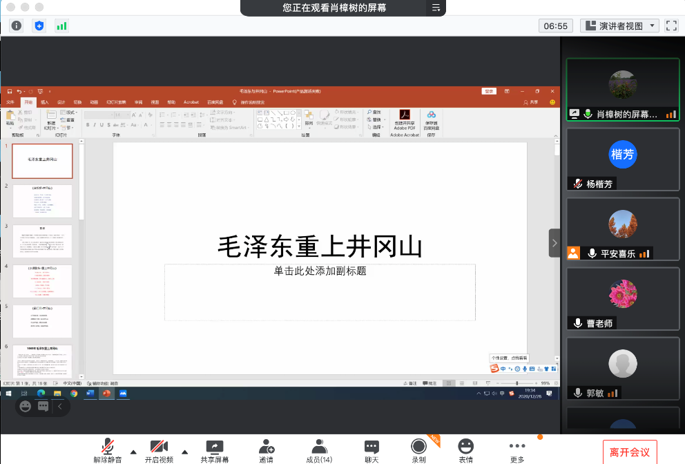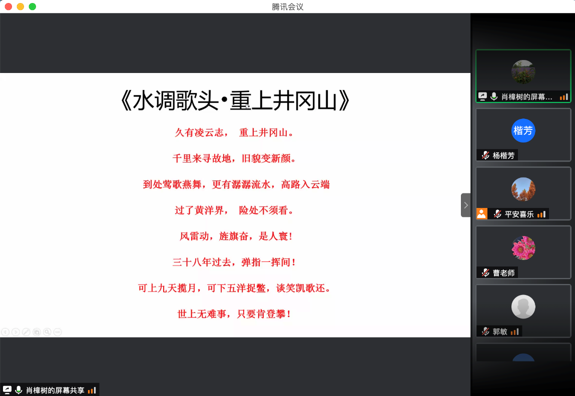 肖樟树老师做了“毛泽东重上井冈山”的主题报告。肖老师和大家一起重新赏学了毛泽东重上井冈山所作的《念奴娇·井冈山》《水调歌头·重上井冈山》,“久有凌云志,重上井冈山……” 这是毛泽东1965年5月重上井冈山时写下的不朽名篇,曾传遍祖国的大江南北,为千百万人所咏诵。毛泽东重上井冈山留下了许多鲜为人知的生动的故事。肖老师深情地介绍了毛主席离开井冈山的时候结算伙食费的情景,整个过程的很多小事,让每位教师为之动容,也重新认识和回顾了这段历史。