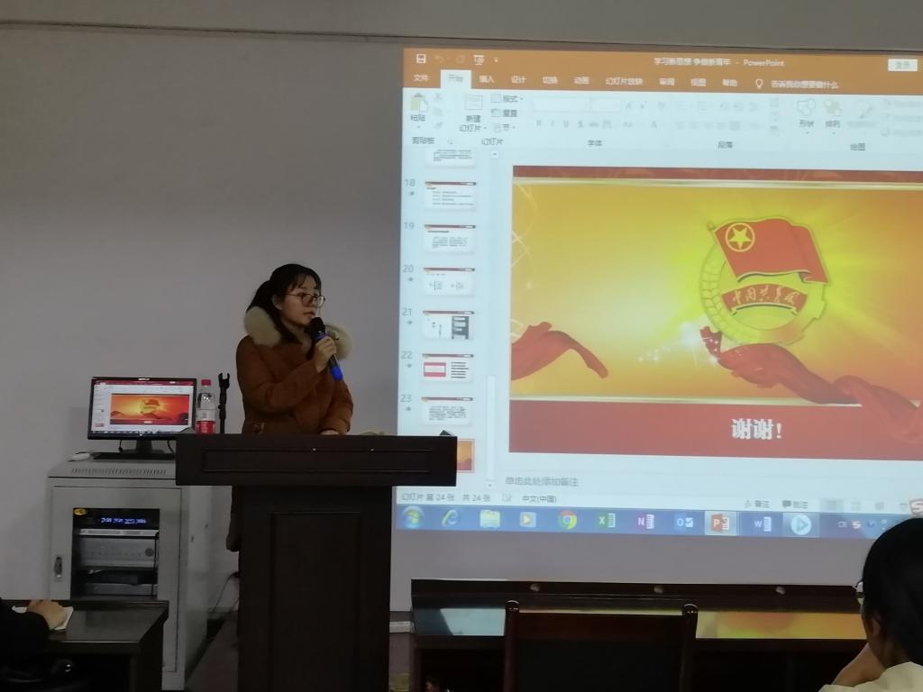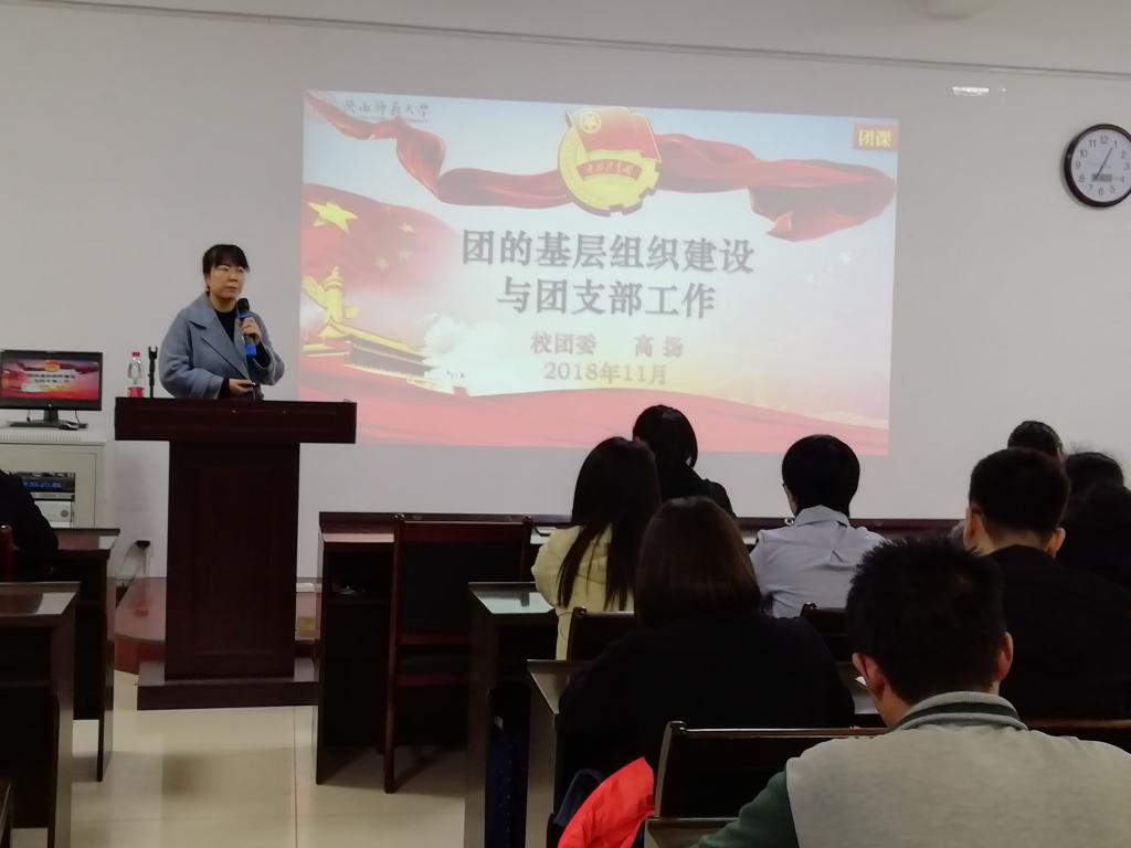 我校团委副书记高扬老师进行了团校第一讲《团的基层组织建设与团支部工作》的授课,她从共青团组织、团的基层组织建设、团支部工作实务、共青团的育人功能、团支部活动资源等五个方面进行了介绍。她指出共青团必赢优惠y272net委员会主要承担着第二课堂育人的任务,负责青年团员的思想教育引导、素质深化拓展、校园文化建设、团的组织建设等,详细地介绍了共青团的建设过程,教育青年学子们坚定不移跟党走,眼中有远方,心中有祖国,脚下有力量。
