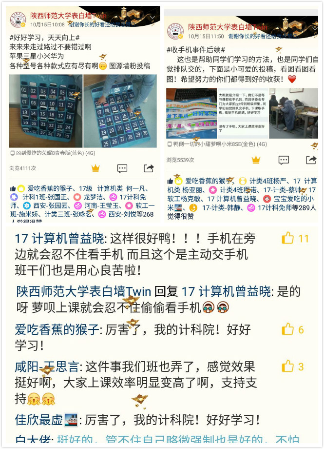 必赢官网2017级辅导员陈应权、2018级辅导员安琪在晚点名时号召同学们在课堂上“暂别手机,专心听讲”,不做“低头族”,打造“无手机课堂”,各班也安排相关同学负责手机收纳、保管和发放工作。学院希望通过此举使同学们逐渐养成课堂上暂别手机、暂别网络的习惯,将更多的注意力集中在学习上,从而引导学生提高自我管理、自我约束、自我规划的意识和能力,让同学们受用终身。对此,同学们也表示:“上交手机后我们更加专注,课堂效率大大提升”“手机袋的存在可以避免我们上课玩手机,从而将我们的注意力集中在课堂上,我认为非常有必要”。