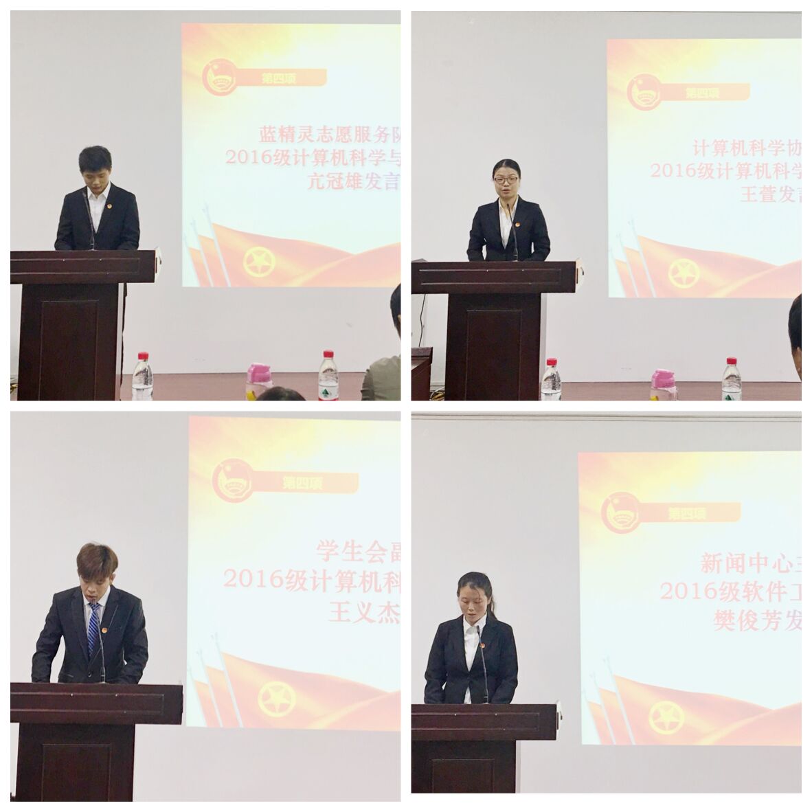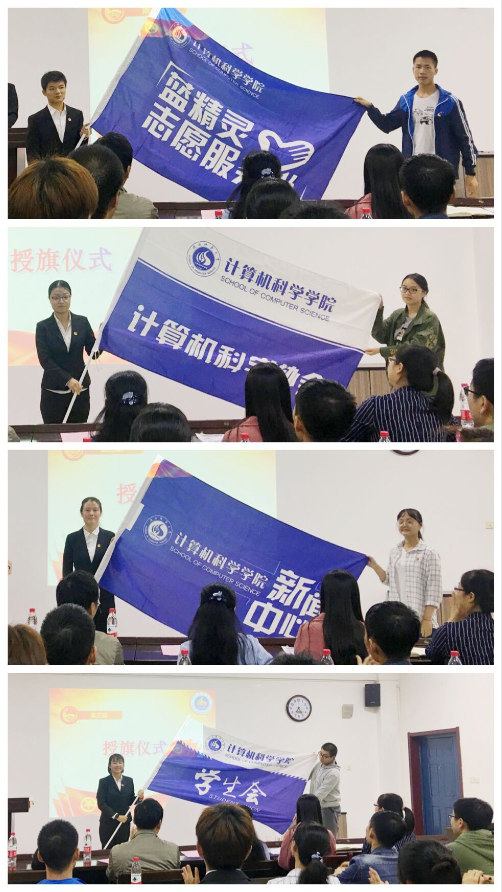 会上,全体成员起立齐唱共青团团歌。郭康凌宣读了《2018-2019学年必赢优惠y272net学生组织干部任职决定》。李文亮、刘佳华、刘童心、唐盼分别为学生会、新闻中心、为计科协和蓝精灵授旗。为增强各组织成员之间的集体感、凝聚力,会上还组织进行了交流活动。学生会副主席王义杰、新闻中心主任樊俊芳、计算机科学协会主席王萱、蓝精灵志愿服务队队长亢冠雄依次进行了发言,总结了上一年中所在部门的工作任务,并对未来的工作进行了展望、定下了目标。