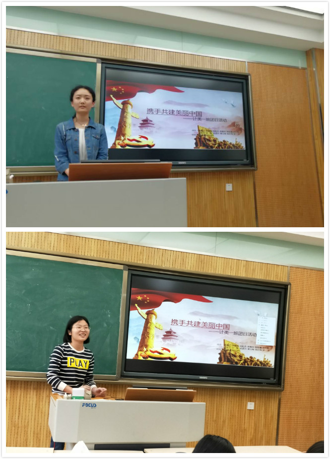 活动伊始,团支书姜姝荣同学从身边环境入手,谈及祖国大好河山,吸引团员们的学习兴趣,继而自然引入团日活动的主题——携手共建美丽中国。随后,谢佩珍同学和钟倩妮同学对此进行多方面、多层次、多角度的阐述。谢佩珍同学以美丽二字为契机,从身边易感知的三个小问题:美丽是什么、美丽的本质是什么,以及我们为什么要美丽着手,浅入深出地阐述了何为美丽中国和为什么要建设美丽中国这样两个较为宏观的问题。紧接着钟倩妮同学从如何建设美丽中国出发,化大为小,辅以实例,并穿插相关报道视频,生动阐述了作为大学生的我们应当如何为建设美丽中国添砖加瓦以及相应成效。在活动尾声也是本次活动的高潮,团支书姜姝荣同学用一个趣味小游戏画画传递猜词,将重视和不注重美丽中国的两种情况入于画中,使团员们在轻松的游戏氛围中,深刻体味到美丽中国的重要性和必要性。最后,姜姝荣同学简明扼要地总结了本次活动,再次强调了美丽中国的意义。活动结束后,参与团员纷纷合影纪念。许多团员表示,作为新时代的大学生,他们一定会以自己的能力,从现在做起,从身边小事做起,使中国更加美丽。