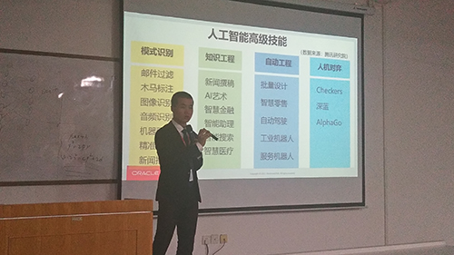 本次讲座主要分为三个部分:人工智能的前沿应用,人工智能的技术架构和大学生生涯规划。讲座开始,吴松老师通过“阿尔法狗”和“小度”等人工智能应用的例子引入主题。关于人工智能的前沿应用,吴松老师介绍的有:索菲亚(历史上首个获得公民身份的机器人)、京东无人仓库、亚马逊无人机派送快递等。这些前沿应用向同学们生动地展示了人工智能的发展。随后,在人工智能的技术框架部分,吴松老师介绍了四部分内容:模式识别、知识工程、自动工程和人机对弈。就知识工程中的新闻撰稿,吴老师提到,现在百度上许多文章都是机器生成,而非撰稿人编辑得到的,人工智能编写新闻,好处在于具有时效性,可以在很短的时间里,编写出易于理解的新闻。最后,吴老师对以后想要从事人工智能的同学进行了生涯规划,他建议,数学功底较好的同学可以从大数据分析方向进行研究,而数学一般的同学可以从Python入手。