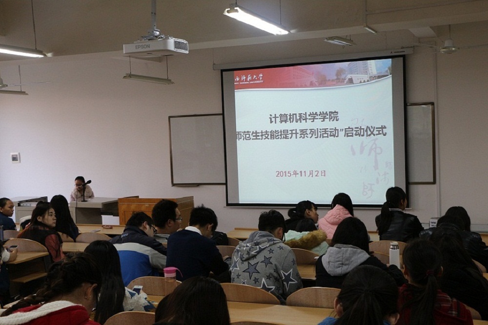 11月2日下午16:30,必赢官网“师范生技能提升系列活动”启动仪式在文津楼219教室举行。学院党委副书记袁冰、副院长马苗、团委书记胡雯洁、教学秘书朱炜、2012级辅导员张冲、2013级辅导员冯倩出席了启动仪式。2013级、2014级计算机科学与技术专业全体免费师范生参加了本次活动。启动仪式由2014级辅导员郭康凌主持。