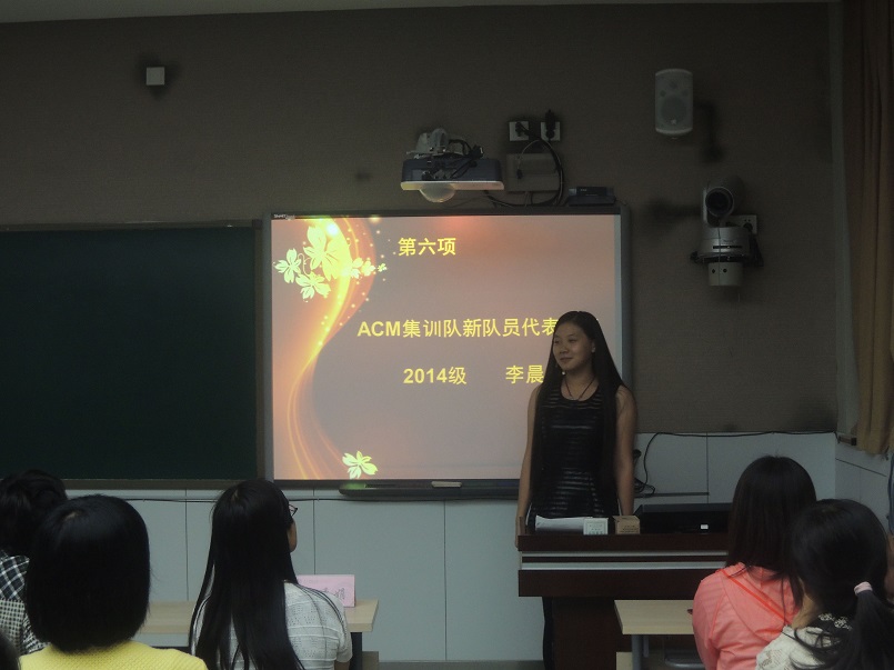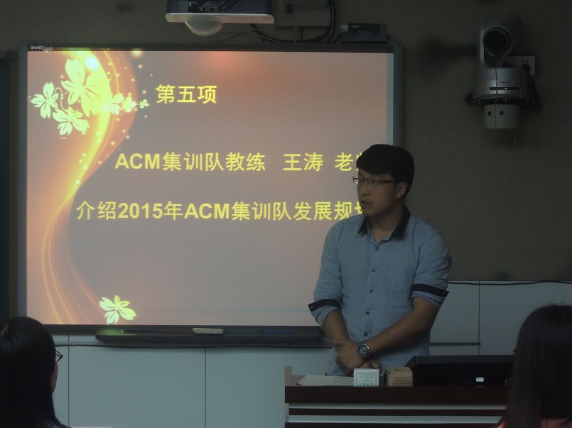 王涛老师随后向大家介绍了2015年ACM集训队的发展规划。他指出,在学校和学院各级领导的大力支持和帮助下,我校ACM集训队虽然成立时间不长,但已经在多项ACM-ICPC赛事中取得了优异成绩。2015年,集训队将采用“以老带新”的模式,每周固定组织训练,力争在2015年ACM省级、国家级和亚洲区域级别的比赛中有所突破,取得更加优异的成绩。2014级李晨子同学作为新队员代表,表达了加入我校ACM集训队的喜悦和自豪之情,她表示在今后将刻苦训练,支持以恒,争取未来能在必赢优惠y272netACM集训队的荣耀历程中增添一缕光辉。