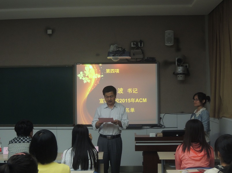 接着,与会嘉宾为在本届比赛中获得各类奖项的60名学生颁发了荣誉证书及奖品。根据比赛成绩和个人意愿,共从获奖选手中选拔出33人加入我校2015年ACM集训队,学院党委书记胡波老师宣读了2015年ACM集训队名单。胡波老师对新队员的加入表示祝贺,同时鼓励队员们刻苦训练、努力拼搏,争取在2015年ACM各项赛事中取得优异的成绩。