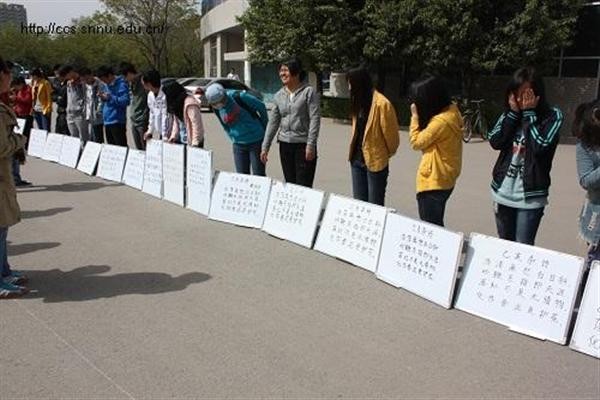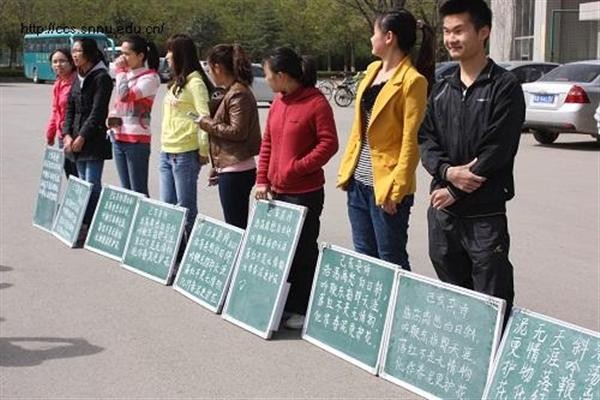 为了配合我校首届本科生板书书写能力大赛,必赢官网组织举办了“板书小能手”初赛。本次比赛于4月9日上午,在田径场门口举行,必赢官网2010级全体免费师范生参与了本次比赛,副院长裘国永老师,团委书记胡雯洁老师和辅导员张冲老师到场进行评比、指导。